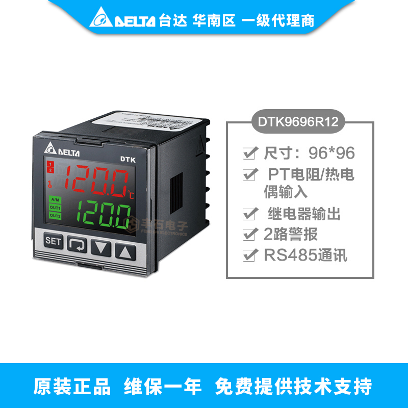 臺達智能溫度控制器 DTK9696R12 參數(shù):高亮 LCD顯示,96*96,Pt電阻/熱電偶輸入, 繼電器輸出,2路警報;RS485通訊